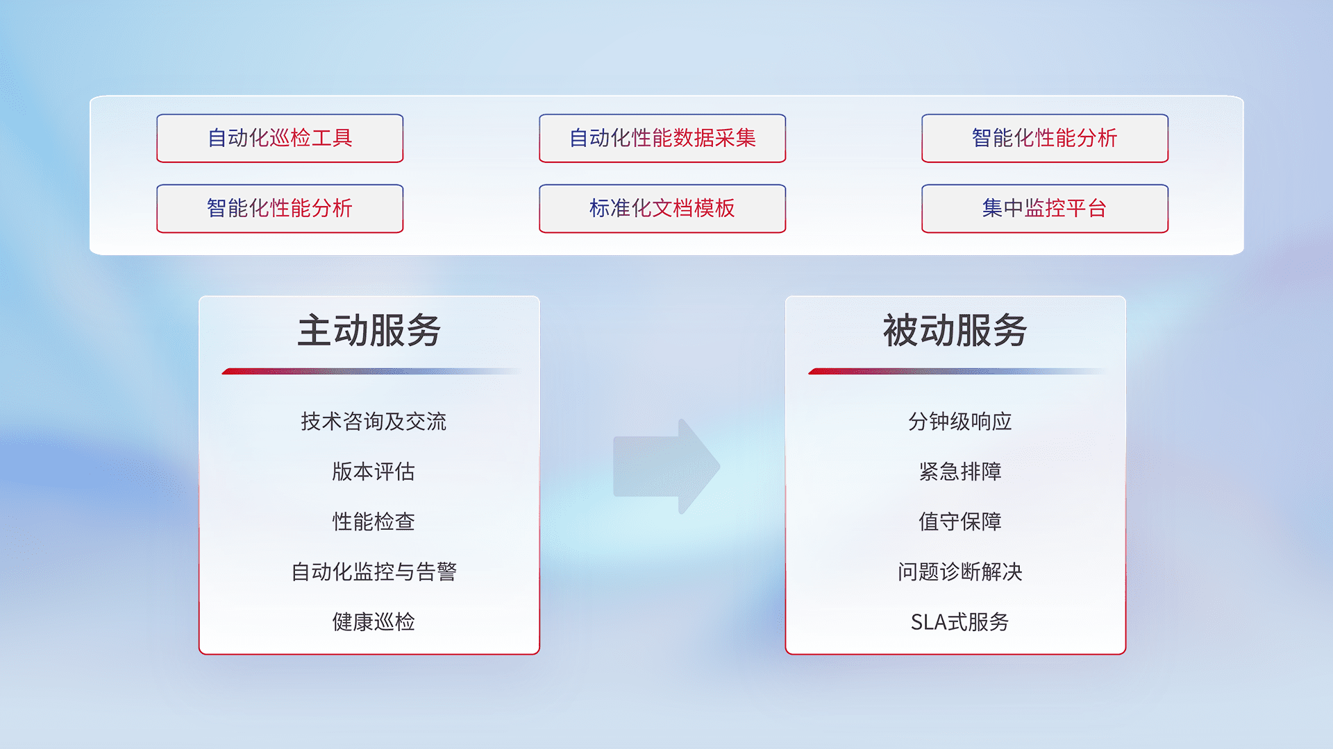 智能化工具和标准化文档,,,,保障服务质量,,提供主动服务(包含技术咨询、、、、版本评估、、、、性能检查、、、、自动化监控与告警、、、、健康巡检)和被动服务包含(分钟级响应、、、紧急排障、、、值守保障、、、、问题诊断解决、、SLA服务)。。。